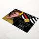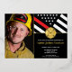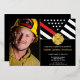 This design features a firemen's flag with black and white stripes, and a thin red line stripe as well. "Congratulations" and a fireman's badge sits above all of the party details for the retiring firefighter, lieutenant, or chief's retirement party. The invitations can also be customised for a firefighter academy graduate. Customise this design even further with a photo of the retiring firefighter.