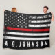 A custom name distressed style Fire fighter flag fleece blanket. The thin red line running across the entire fleece is representative of American Fire fighters and fire rescue. Follow the directions in the sidebar to add a name and to have it look perfect underneath the flag.