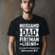 A firefighter stands confidently wearing a shirt that proudly announces his roles as a husband and dad, celebrating the heroic journey of being a firefighter. The atmosphere radiates warmth and pride, highlighting family and service.