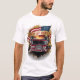 This custom t shirt features Firefighters stand in front of a fire truck with an American flag behind them. symbolising bravery and heroism,