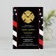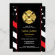 This design features a firemen's flag with black and white stripes, and a thin red line stripe as well. A fireman's badge sits above all of the party details for the retiring firefighter, lieutenant, or chief's retirement party.