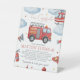 Firetruck-themed birthday time capsule sign featuring watercolor fire engine, helicopter, clouds, extinguisher, megaphone, axe, hydrant, and safety cones. Perfect for a firefighter or firetruck first birthday party. Guests can leave wishes, predictions, and heartfelt messages for Mattew to open on his 18th birthday. A charming keepsake sign that coordinates with matching firetruck invitations, thank you cards, banners, and party decorations.