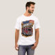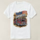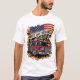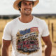 This custom t shirt features Illustration of a fire truck with firefighters against a backdrop of flames and an American flag. symbolising bravery and heroism,
