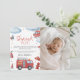 Adorable firetruck-themed photo thank you card featuring watercolor fire engines, firefighter gear, clouds, and rescue helicopter illustrations. Includes space for a personalized message and a photo of your little one. Perfect for firefighter or fire station–themed first birthdays and kids’ parties. Great for printable or digital use and fully customizable.