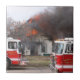 A ceramic tile featuring a photo of fire trucks in front of a house fire.