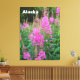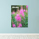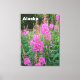Features a digital painting of Fireweed (Epilobium augustifolium). Text reading "Alaska" is also present. The species name angustifolium is a portmanteau of the Latin words angusti meaning ‘narrow’, and folium meaning ‘leaf’. It shares this name with other species of plant including Vaccinium angustifolium. In mid to late summer Fireweed begins blooming in the middle of the stalk, with each successive flower blooming just above the one before it. When the last flowers bloom, at the top of the stalk, it is considered a sign that summer, or tourist season, has ended. At that time the earliest blooms seed and turn to cotton. When the fireweed turns to cotton, Alaskans say there are about six weeks until winter begins. Fireweed is often seen in open fields, pastures, and particularly burned-over lands; the common name Fireweed derives from the species’ abundance as a coloniser on burnt sites after forest fires. As a pioneer species it quickly colonises open areas with little competition, makes it a clear example of a pioneer species. Plants grow and flower as long as there is open space and plenty of light, as trees and brush grow larger the plants die out, but the seeds remain viable in the soil seed bank for many years, when a new fire or other disturbance occurs that opens up the ground to light again the seeds germinate. Some areas with heavy seed counts in the soil, after burning, can be covered with pure dense stands of this species and when in flower the landscape is turned into fields of colour. In Britain the plant was considered a rare species in the 18th century; confined to a few locations with damp, gravelly soils. The plant’s rise from local rarity to widespread weed seems to have occurred at the same time as the expansion of the railway network, and the associated soil disturbance. The plant became locally known as bombweed due to its rapid colonisation of bomb craters in the second world war. Reddish stems are usually simple, erect, smooth, 1½–8 feet high with scattered alternate leaves. Reddish-brown seed capsules bear many minute brown seeds, about 300 to 400 per capsule and 80,000 per plant. The seeds have silky hairs to aid wind dispersal and are very easily spread by the wind, often becoming a weed and a dominant species on disturbed ground. Once established, the plants also spread extensively by underground roots, an individual plant eventually forming a large patch. The leaves of Fireweed are unique in that the leaf veins are circular and do not terminate on the edges of the leaf, but form circular loops and join together inside the outer leaf margins. This feature makes the plants very easy to identify in all stages of growth. When Fireweed first emerges in early spring, it can closely resemble several highly toxic members of the lily family, however, it is easily identified by its unique leaf vein structure. The young shoots were often collected in the spring by Native American people and mixed with other greens. As the plant matures the leaves become tough and somewhat bitter. The southeast Native Americans use the stems in the stage. They are peeled and eaten raw. When properly prepared soon after picking they are a good source of vitamin C and pro-vitamin A. The Dena’ina add fireweed to their dogs’ food. Fireweed is also a medicine of the Upper Inlet Dena’ina, who treat pus-filled boils or cuts by placing a piece of the raw stem on the afflicted area. This is said to draw the pus out of the cut or boil and prevents a cut with pus in it from healing over too quickly. The root can be roasted after scraping off the outside, but often tastes bitter. To mitigate this, the root is collected before the plant flowers and the brown thread in the middle removed. In Alaska, candies, syrups, jellies, and even ice cream are made from fireweed. Monofloral honey made primarily from fireweed nectar has a distinctive, spiced flavour. In Russia, its leaves were often used as tea substitute and were even exported, known in Western Europe as Kapor tea. Fireweed leaves can undergo fermentation, much like real tea. Today, Kapor tea is still occasionally consumed though not commercially important.