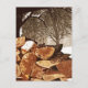 This postcard features a pile of firewood. The wood is stacked in the shed. Beyond the woodpile is a cold, snowy wintry scene.