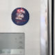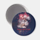 Fireworks 4th of July Independence Day round circle fridge magnets. Be patriotic and celebrate America with this beautifully designed trendy, modern photograph. Red white and blue colours souvenir. Quote 'Happy 4th Of July'. Red typography. Customise text to suit your needs if desired. Look for matching products in my store collection. Image copywrite Marg Seregelyi Photography.