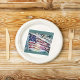 This American, flag image, is highlighted against, fireworks bursting, in a colourful display of, red, white, blue, and yellow, flares-in a cloudy, twilight sky, of slate-blue.