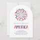 These elegant and fun red white and blue Independence Day party invitations feature red and blue fireworks and stars, and modern text that says "America." The invitation as shown is an an arch shape, but you can easily change the shape as well as the wording to reflect your own type of patriotic Fourth of July celebration.