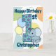 An adorable birthday card to celebrate your baby's first birthday. On the front of the card is a big number one in blue with purple spots. Above the number are the words 'Happy Birthday' in blue lettering. Below the number is a template also in blue to add your name. In front of the number is a cute cartoon grey elephant. And behind the number are two balloons one in a pale blue and one in a pale yellow. The background is white with shapes in pale colours of blue, green and orange. Inside the card is a template to add your own personal birthday message.