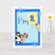 1st birthday card with funny clown, penguin and ice cream and balloons, on a blue background. Easily personalize this design by adding or changing the text.