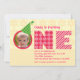 Modern and striking first birthday invitation. Features the word "ONE" in big letter with mixed patterns. Add the picture of your child inside the letter "O" for a personal touch. The party hat on top of the pictures adds a fun touch. Cute and colourful invitation ideal to celebrate this important milestone birthday.
