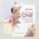 This elegant first birthday invitation displays a pampas grass with different shades of mauve pink. The font is a shade of dark mauve pink but can easily be edited to a different colour. You can also bundle up with matching stationery and coordinating paper goods to go with. Napkins, plates, thank you cards and more. See Pampas Elegance collection.