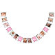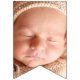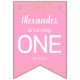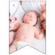 Baby first birthday party bunting flags featuring pictures of the last 12 months, and 4 pink flags with gold glitter, their name, age, and date.