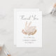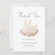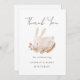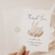 Pretty blush first birthday thank you card features a sweet watercolor sleeping bunny on a boho floral and leaf bed. On the front is beautiful thank you calligraphy script, and the back includes a customisable thank you message with an adorable bunny. This card can be personalised for any child's age!