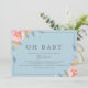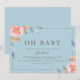 This first bloom floral horizontal oh baby baby shower invitation is perfect for a spring baby shower. The modern design features pink and orange watercolor flowers on a light blue background.
