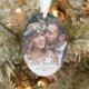 Celebrate a joyful 1st holiday as a married couple with an elegant custom photo "Our First Christmas as Mr. & Mrs." oval acrylic ornament. The pictures and all wording on this template are simple to personalise. The black and white overlay design features simple elegant script calligraphy, modern minimalist typography names & year, and two pictures of your choice. The couple's wedding date is printed on the back. This unique wedding keepsake makes an elegant wedding gift idea for the bride and groom and adds an elegant touch to the newlywed's Xmas home decor.