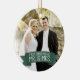 This photo Christmas tree ornament features photo frame to fill the front of the ornament. A graphic of a dark green ribbon banner, near the bottom, features the text: First Christmas as Mr. & Mrs. Custom text, on the back, allows you to add the names of the bride and groom and the year. This ornament is a perfect Christmas gift for the newlyweds.