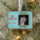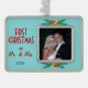 This photo Christmas ornament features a customisable photo frame accented with garland and colourful baubles on the top and bottom. The read text (on and light teal background) reads: First Christmas as Mr. and Mrs. 2014. The year is customisable.
