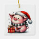 Whimsical illustration of a cute pig in a Santa hat with a wrapped gift printed on a ceramic ornament commemorating baby's first Christmas. Text on back can be changed. AI assisted graphic purchased with commercial use. Artwork: RedHeronLighthouse