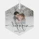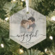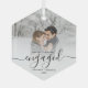 Commemorate your engagement with this beautiful modern keepsake ornament. The black text reads "Our first Christmas engaged," with the word "engaged" in elegant handwriting script with flourishes before and after. Replace the sample image with your favourite photo, and add your names and the year. A white gradient filter helps make the text pop.