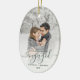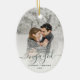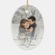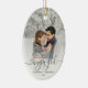 Commemorate your engagement with this beautiful modern keepsake ornament. The dark green text reads "Our first Christmas engaged," with the word "engaged" in elegant handwriting script with flourishes before and after. Replace the sample image with your favourite photo, and add your names and the year. A white gradient filter helps make the text pop.