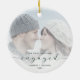 Commemorate your engagement with this beautiful modern keepsake ornament. The dark green text reads "Our first Christmas engaged," with the word "engaged" in elegant script with swashes before and after. Replace the sample image with your favourite photo, and add your names and the year. A white gradient filter helps make the text pop.