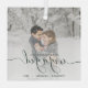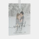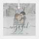 Commemorate your engagement with this beautiful modern keepsake ornament. The dark green text reads "Our first Christmas engaged," with the word "engaged" in elegant handwriting script with flourishes before and after. Replace the sample image with your favourite photo, and add your names and the year. A white gradient filter helps make the text pop.