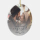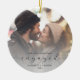 Commemorate your engagement with this beautiful modern keepsake ornament. The charcoal grey text reads "Our first Christmas engaged," with the word "engaged" in elegant script with swashes before and after. Replace the sample image with your favourite photo, and add your names and the year. A white gradient filter helps make the text pop.