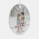 Commemorate your engagement with this beautiful modern keepsake ornament. The dark red text reads "Our first Christmas engaged," with the word "engaged" in elegant handwriting script with flourishes before and after. Replace the sample image with your favourite photo, and add your names and the year. A white gradient filter helps make the text pop.