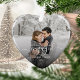 Commemorate your engagement with this beautiful heart-shaped keepsake ornament. The white text reads "Our first Christmas engaged," with the word "engaged" in elegant handwriting script with flourishes before and after. Replace the sample image with your favourite photo, and add your names and the year. A black gradient filter helps make the text pop.