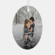 Commemorate your engagement with this beautiful modern keepsake ornament. The white text reads "Our first Christmas engaged," with the word "engaged" in elegant handwriting script with flourishes before and after. Replace the sample image with your favourite photo, and add your names and the year. A dark gradient filter helps make the text pop.