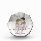 Celebrate your engagement with this beautiful modern keepsake photo block. The burgundy red text reads "Our first Christmas engaged," with the word "engaged" in elegant handwriting script with flourishes before and after. Replace the sample image with your favourite photo, and add your names and the year. A white gradient filter helps make the text pop.