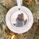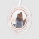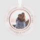 This personalised Christmas ornament features a modern faux rose gold design on faux pink marble background. Personalise the names, year and photo. This template works best with landscape format photos with the couple in the centre.