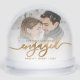 Commemorate your engagement with this beautiful modern keepsake snow globe. The text reads "Our first Christmas engaged," with the word "engaged" in elegant gold faux foil handwriting script with flourishes before and after. Replace the sample image with your favourite photo, and add your names and the year in gold-coloured sans serif font. A white gradient filter helps make the text pop.