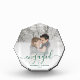 Celebrate your engagement with this beautiful modern keepsake photo block. The pine green text reads "Our first Christmas engaged," with the word "engaged" in elegant handwriting script with flourishes before and after. Replace the sample image with your favourite photo, and add your names and the year. A white gradient filter helps make the text pop.