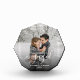 Celebrate your engagement with this beautiful modern keepsake photo block. The white text reads "Our first Christmas engaged," with the word "engaged" in elegant handwriting script with flourishes before and after. Replace the sample image with your favourite photo, and add your names and the year. A black gradient filter helps make the text pop.