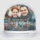 Commemorate your engagement with this beautiful modern keepsake snow globe. The white text reads "Our first Christmas engaged," with the word "engaged" in elegant handwriting script with flourishes before and after. Replace the sample image with your favourite photo, and add your names and the year. A dark gradient filter helps make the text pop.