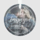 Celebrate your engagement with this beautiful, classic keepsake ornament.The white text reads “Our First Christmas,” with the word “Engaged” below in an elegant handwritten script. Your names and year are in classic serif font. Replace the placeholder photo with your favourite photo. The photo is framed with an elegant dotted border. A dark gradient filter makes the white text and border pop.