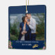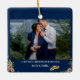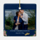 A stylish minimal photo holiday christmas ornament with classic typography "Our first Christmas engaged" in black on a clean simple minimalist blue background. The photo, greeting and name can be easily customised for a personal touch. A simple, minimalist and contemporary christmas design to announce your engagement to your loved ones! The image shown is for illustration purposes to be replaced with your own photo.