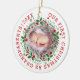 First Christmas as grandparents wreath photo ceramic ornament. This festive design showcases a photo of the baby in a Christmas wreath frame and the text : "OUR FIRST CHRISTMAS AS GRANDPARENTS. 20XX" in red.