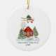 Soar into the season with this whimsical vintage style Aviation themed Christmas ornament! Design features a classic Cessna airplane flying in the sky proudly carrying a Christmas tree a top it's airplane wings. Below, a house surrounded by snow covered pine trees and a sled, while “[NAME] FIRST CHRISTMAS [YEAR]” shines below the cute scene.