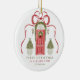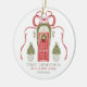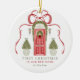 Celebrate the first Christmas in your new home with this cute watercolor design with an illustration of a red door - decorated for the holiday season and two Christmas trees, surrounded by a delicate red bow.