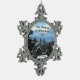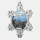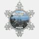 This custom pewter, snowflake shaped, ornament features a beautiful rustic setting on a mountain top. The rustic cabins have snowy roofs as well as the lovely spruce fir trees. The text reads 'First Christmas in our new home', and can be easily customised. The Name and Year is easy to personalise by just typing over them. The rustic photo can also be modified to use a photo of your own home, by clicking on 'customise it'.