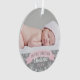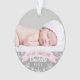 "My First Christmas" banner and snowflake border photo ornament design can be personalised with the baby girl's name and birth year. Includes a second photo on the back. Light pink, grey and white colours.