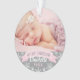 "My First Christmas" banner and snowflake border photo ornament design can be personalised with the baby girl's name and birth year. Includes a second photo on the back. Light pink, grey and white colours.