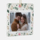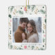 Celebrate your very first Christmas as newlyweds with our charming First Christmas Married & Merry Christmas ornament! Featuring a whimsical botanical design, this square ornament beautifully highlights your favourite photo on a backdrop of festive pink ornaments, simple pine greenery, and sophisticated touches of gold. We provided room on the back for another of your favourite photos. Makes a lovely keepsake! Be sure to check out other options in our First Christmas Collection.