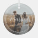 Celebrate your wedding with this beautiful, classic keepsake ornament. The white text reads “Our First Christmas,” with the word “Married” below in an elegant handwritten script. Your names and year are in classic serif font. Replace the placeholder photo with your favourite photo. The photo is framed with an elegant dotted border. A dark gradient filter makes the white text and border pop.