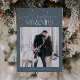 Minimal and elegant holiday card for the newlyweds celebrating their first Christmas together as husband and wife featuring a text that says "First Christmas as Mr & Mrs" with dots. The background is slate blue.